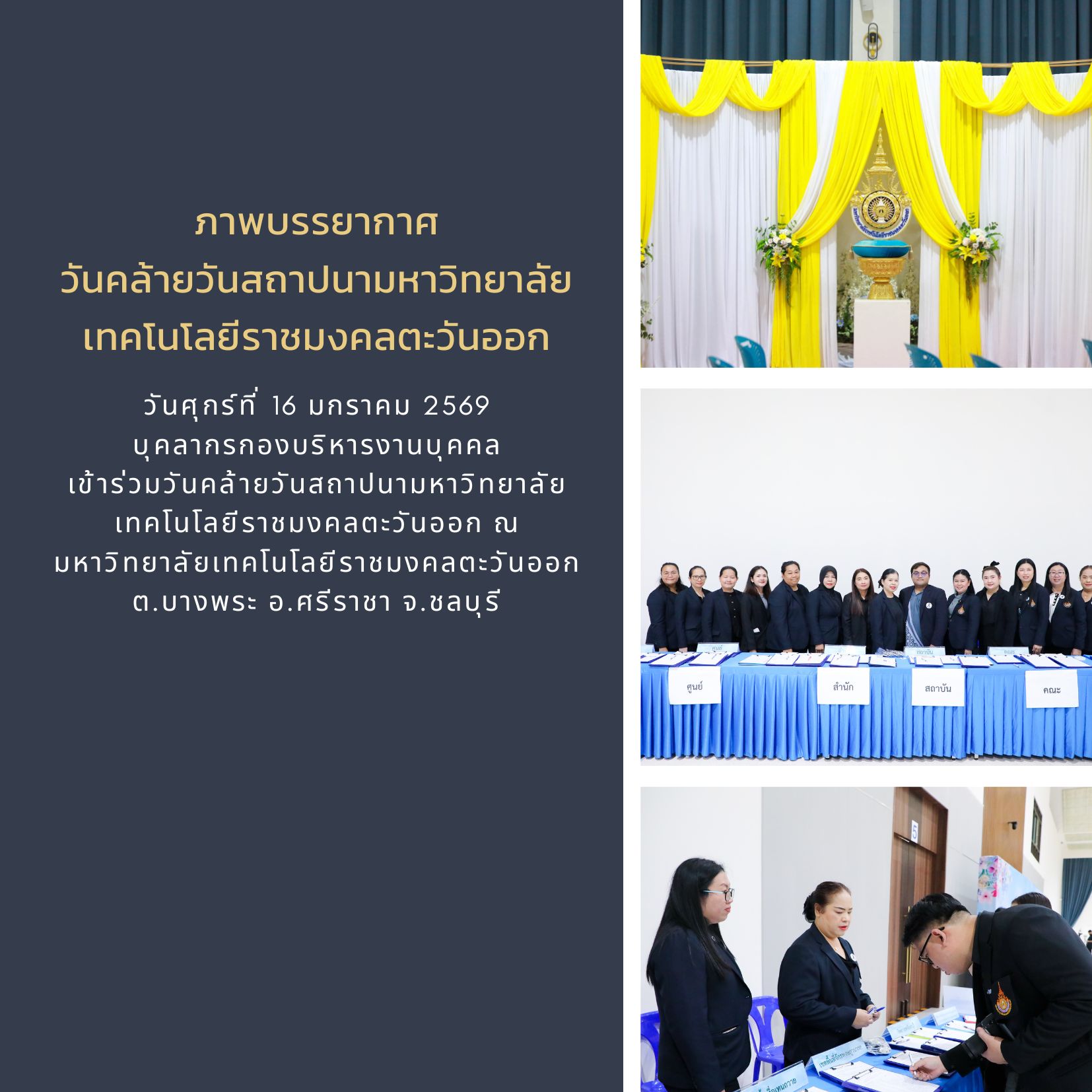 วันศุกร์ที่ 16 มกราคม 2569 บุคลากรกองบริหารงานบุคคล เข้าร่วมวันคล้ายวันสถาปนามหาวิทยาลัยเทคโนโลยีราชมงคลตะวันออก ณ มหาวิทยาลัยเทคโนโลยีราชมงคลตะวันออก ต.บางพระ อ.ศรีราชา จ.ชลบุรี